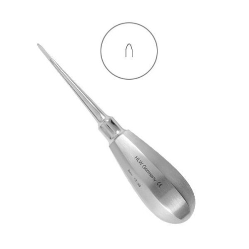 Применяется при удалении корней зубов, особенно в сложных случаях, когда требуется аккуратная люксация. Позволяет работать в узких межкорневых пространствах, минимизируя травматизацию окружающих тканей.