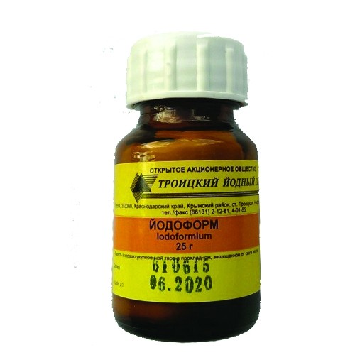 Йодоформ - мелкокристаллический порошок янтарно-жёлтого цвета, обладающий устойчивым и резким запахом. В каждой тёмной стеклянной банке содержится 25 грамм порошка. СОСТАВ: Медикамент содержит 98% активного вещества Трийодметана. Порошок нерастворим в воде, мало растворим в бензине, спирте, органических маслах и легко растворим в эфире. ФАРМАКОЛОГИЧЕСКОЕ ДЕЙСТВИЕ Антисептическое средство, оказывающее широкий спектр противомикробного воздействия. Активное вещество медленно разлагается с образованием йода под воздействием тканевых выделений, воздуха и света. Для йода характерны дезорирующее, антимикробное, рассасывающее и противовоспалительное воздействия. Выделяемый йод способствует скорейшему очищению раневой поверхности и усиливает грануляцию. Анестезирующее и вяжущее воздействие медикамента проявляется при образовании альбуминатов йода на раневой поверхности, которые способны блокировать рецепторное раздражение. По ГОСТу медикамент относится к III классу умеренно опасных веществ при применении наружно. Для лекарственного средства нехарактерно резорбтивно-токсическое и местнораздражающее влияние. ПОКАЗАНИЯ К ПРИМЕНЕНИЮ Порошок Йодоформ применяется в качестве антисептика, наружно для лечения язв и инфицированных ран различного генеза. В стоматологической практике используется паста Йодоформ для обеззараживания при обработке разнообразных ран. Йодоформная паста используется в качестве внутриканального наполнителя в эндодонтической практике. При лечении корневых каналов медикамент применяется в виде временного канального наполнителя совместно с иными препаратами, обладающими антисептическим эффектом. УПАКОВКА Порошок 25 гр.