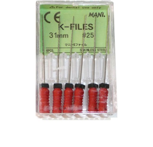 К-файл № 25 Mani – ручной инструмент, применяемый при эндодонтическом лечении для прохождения и расширения зубных каналов. Они вставляются в направлении апикального отверстия, манипуляции производятся движениями вверх-вниз.